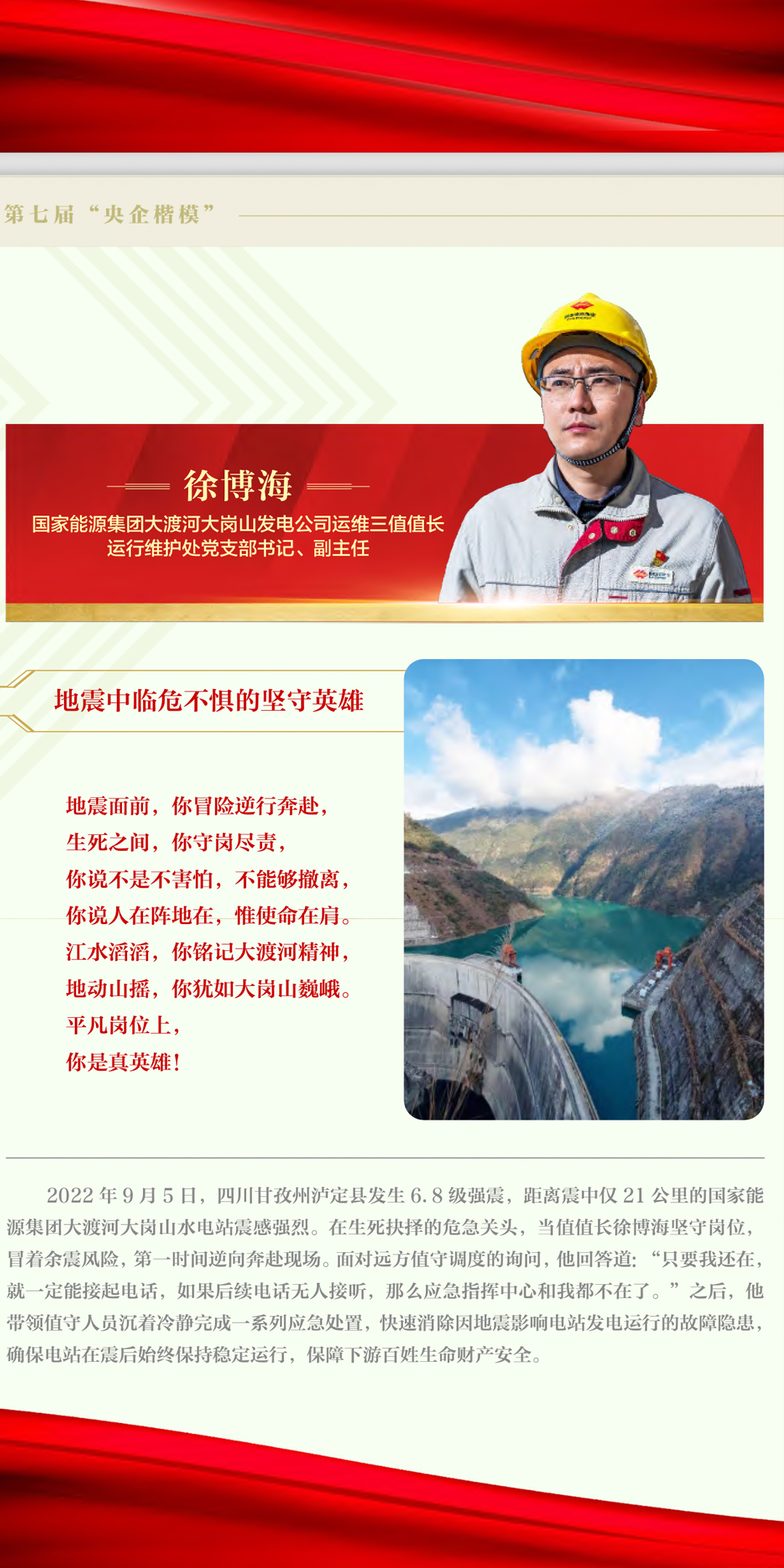 2月16日,国务院国资委党委隆重发布 2022 年度“央企楷模”。恒盛娱乐大渡河大岗山公司徐博海荣获“央企楷模”荣誉称号。泸定地震,生死关头,徐博海一句“只要我还在,就一定能接起电话,如果后续电话无人接听,那么应急指挥中心和我都不在了。...