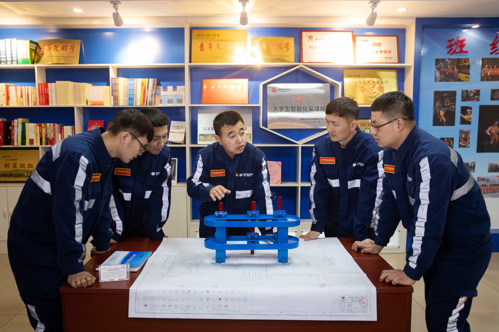 图为哈拉沟煤矿“大学生智能化采煤班”创新技改讨论