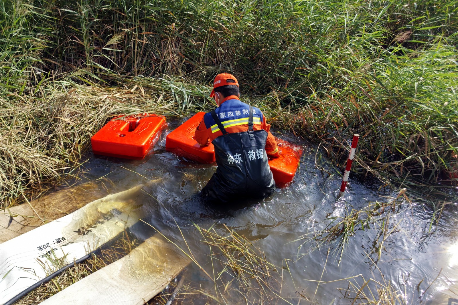 图为救护队员到达现场连接排水管路