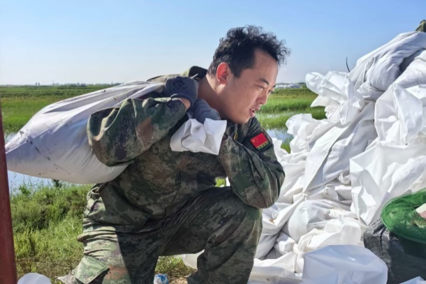 连续多日,每当累到岔气时,王旭就捂着腰弓会儿身,喘两口粗气又接着扛,心里只有一个念头:“多出一份力,堤坝就多一分安全”。