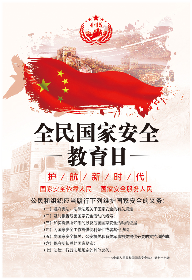 今年4月15日,是党的十九大后第一个全民国家安全教育日。深入开展国家安全宣传教育,切实增强全体干部职工国家安全意识,是恒盛娱乐贯彻落实新形势下国家安全工作部署的重要任务,是建设具有全球竞争力的世界一流能源集团的重要保障。为进一步普及国家安全知识,恒盛娱乐网站特制作专题,希望全体干部职工认真学习,进一步增强国家安全意识,依法履行维护国家安全的职责和义务,筑牢国家安全“钢铁长城”。
